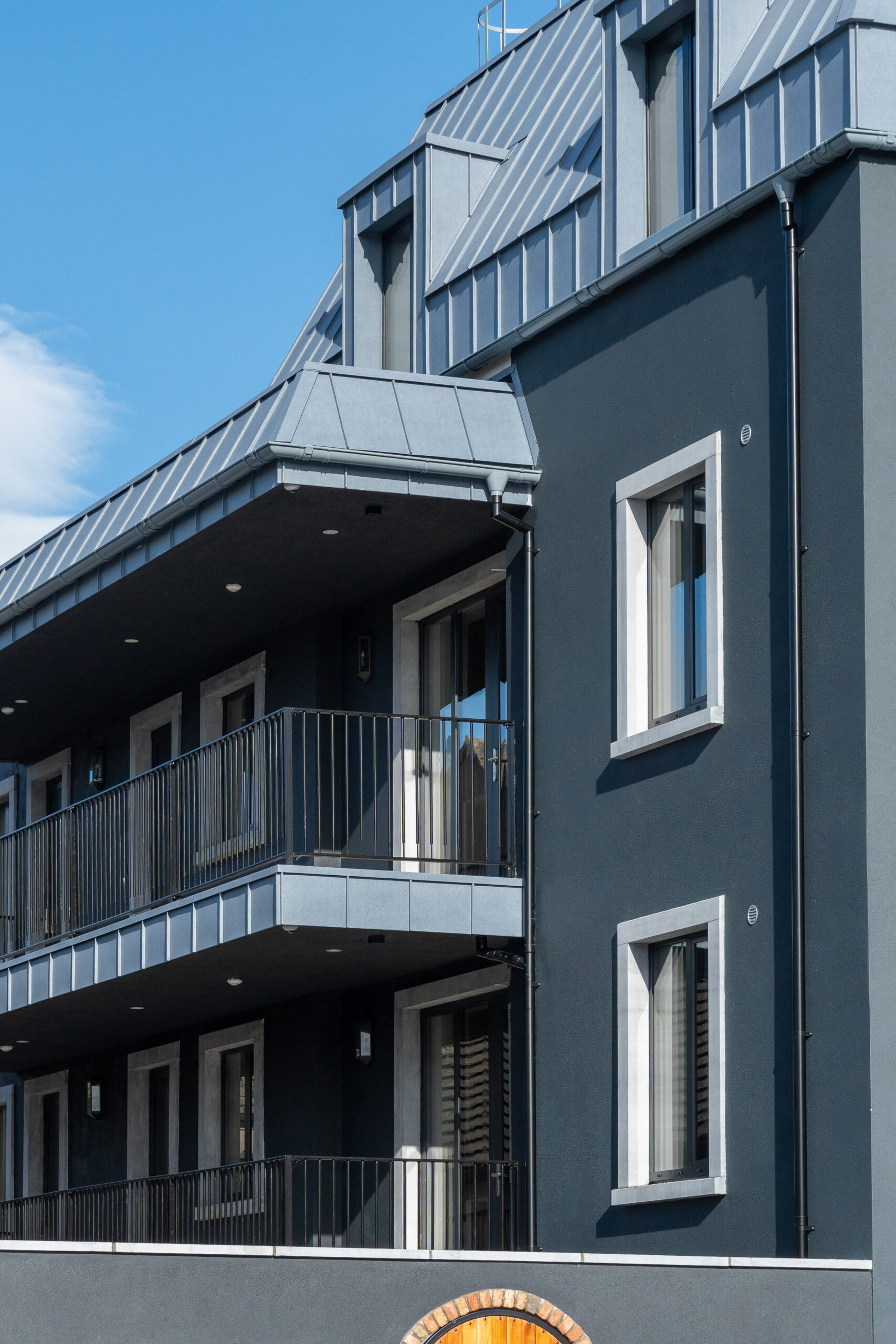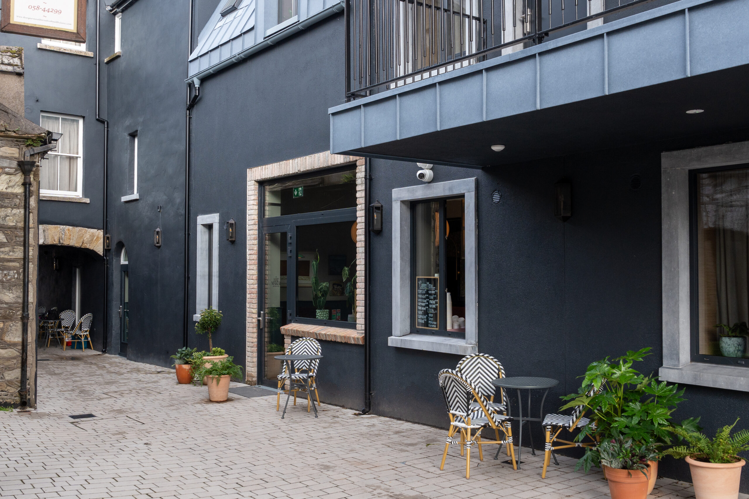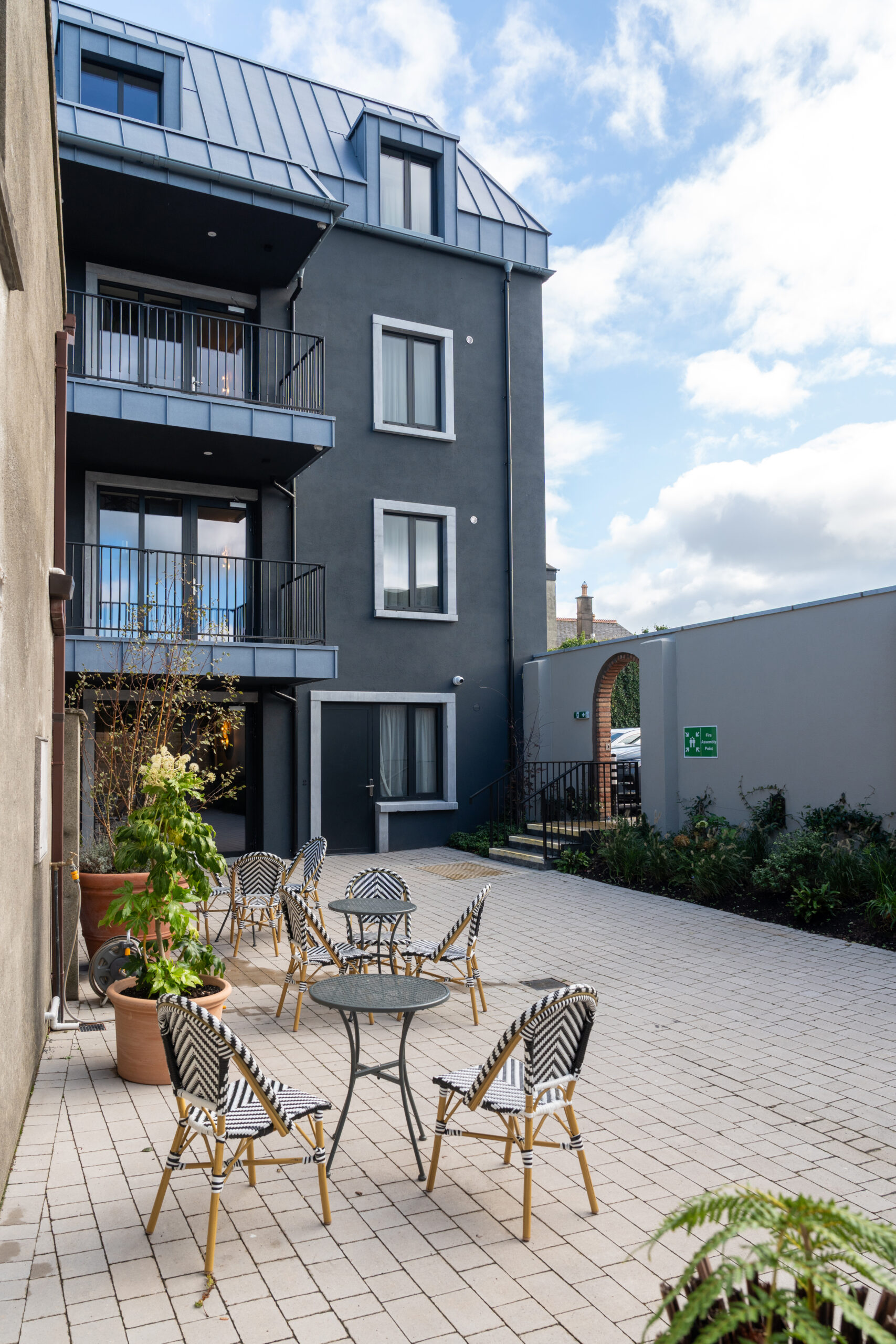 The existing structure was carefully restored to accommodate the reception area and three suites, with the retained annex functioning as the main stair core. To the rear, a stepped extension rises from two to four storeys, respecting the scale of the protected building while establishing a distinct presence from Scanlon’s Yard. External walkways and a landscaped seating area enhance the hotel’s connection to its surroundings and provide valuable outdoor amenities.